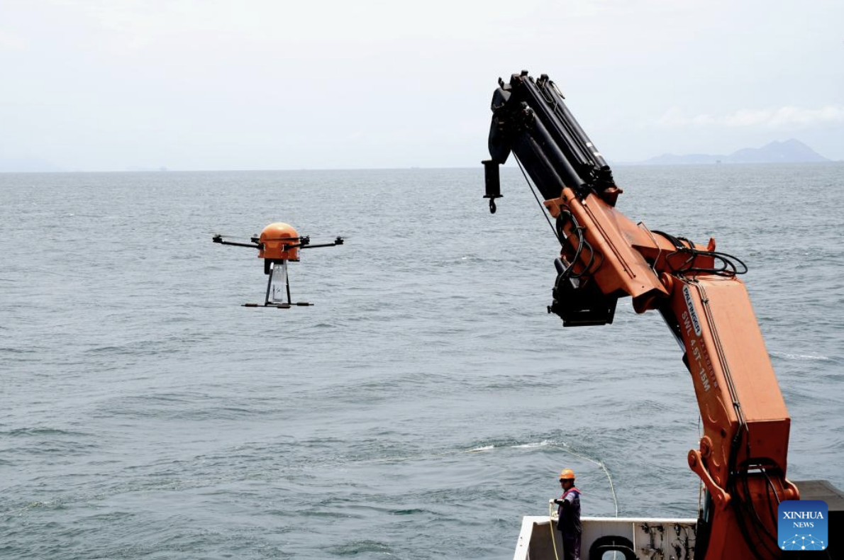 A cross-domain robot takes off from the “Xiangyanghong 10” to conduct scientific research in the northern waters of the South China Sea, July 8, 2025. (Xinhua/Zhang Jiansong)