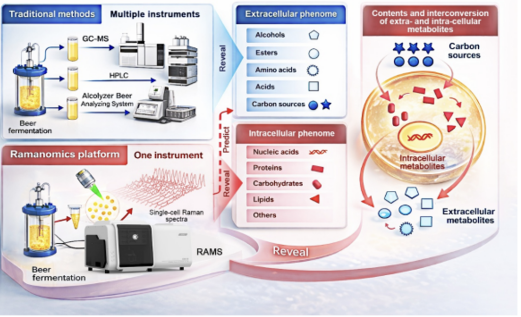 To validate the approach, the researchers tracked an industrial beer fermentation process using the lager yeast Saccharomyces pastorianus, sampling a single production batch over an eight-day period. At each stage of fermentation, they collected high-throughput Raman spectra from individual cells (a “ramanome”) and matched these unique molecular fingerprints to conventional lab measurements of 43 extracellular phenotypes in the fermentation medium.