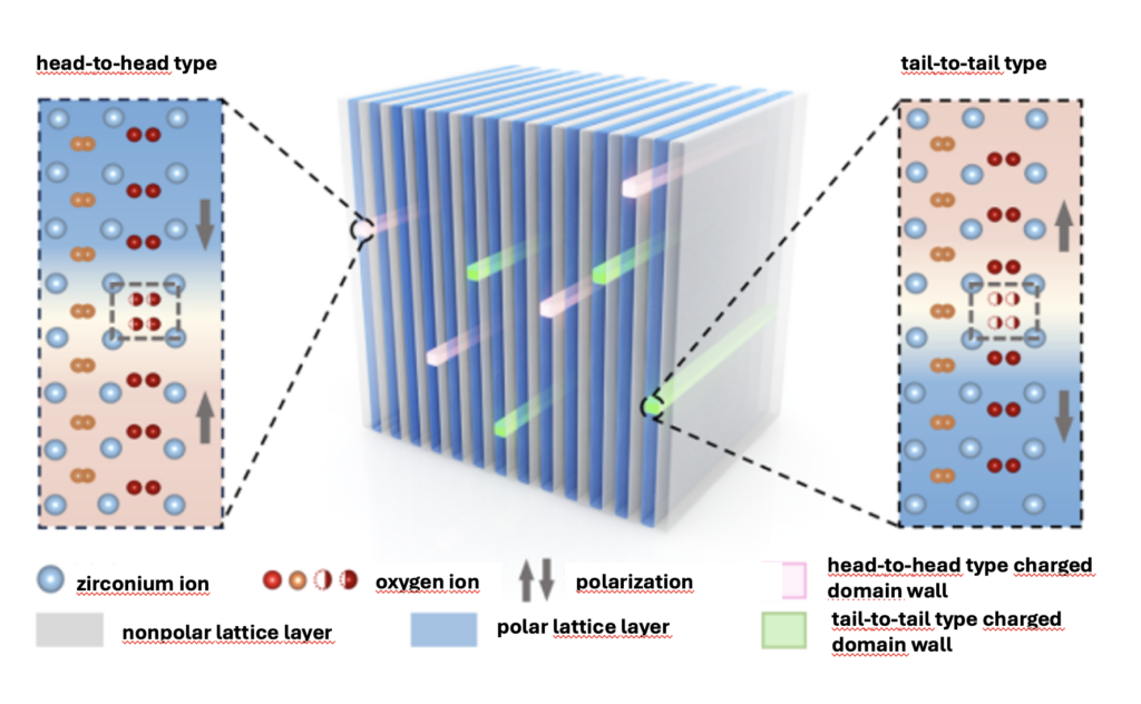 Researchers from the CAS Institute of Physics have made a breakthrough in ferroelectric materials that promises to increase information storage density. The research team identified one-dimensional charged domain walls within a fluorite-structured ferroelectric material, zirconium dioxide. Thin films of this material exhibit one-dimensional charged domain walls (1D CDWs) with head-to-head and tail-to-tail polarization. These 5-nanometer films in an alternating arrangement of nonpolar and polar oxygen ions formed 2D polar sheets that confined the 1D CDWs. Electric-field manipulation of these domain walls led to transport of oxygen ions.