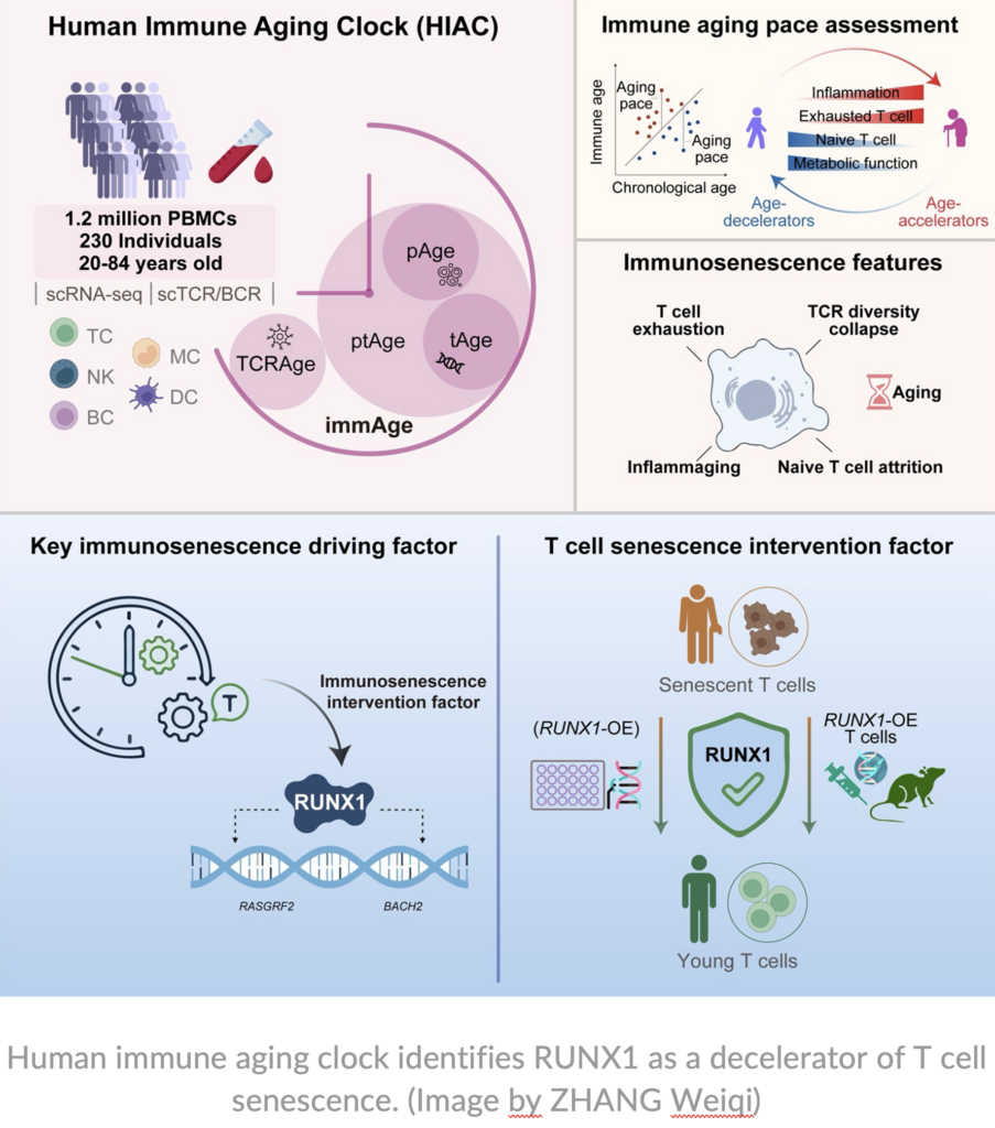 A research center affiliated with the Chinese Academy of Sciences has constructed a high-precision Human Immune Aging Clock (HIAC). The work systematically characterizes the multiscale dynamics of immunosenescence and identifies the transcription factor RUNX1 as a functional “brake” on T-cell senescence.